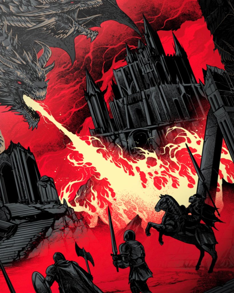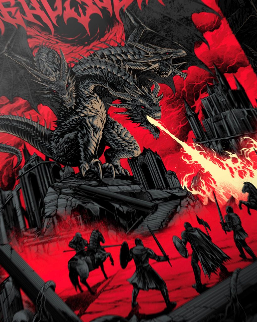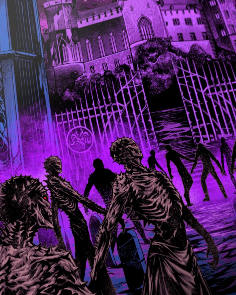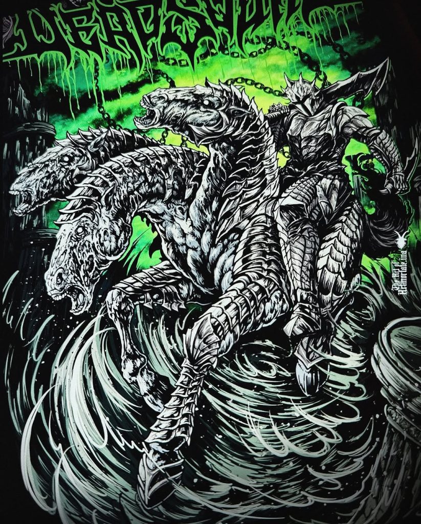 Sementara itu, Anditya Dita merespons tema tur lewat ilustrasi bertajuk “Ritual” dan “Castel”, dua-duanya dirilis dalam bentuk t-shirt. Dalam karya Ritual, seekor naga raksasa berkepala tiga memuntahkan api ke medan pertempuran yang dikuasai kegelapan bernuansa merah, memvisualkan kekacauan dan kekuatan purba yang meledak. Sedangkan Castel menyuguhkan narasi horor-fantasi: barisan zombie seakan menggeruduk gerbang kastil gothic, dengan langit keunguan yang diliputi kawanan kelelawar dan energi apokaliptik yang mendidih.